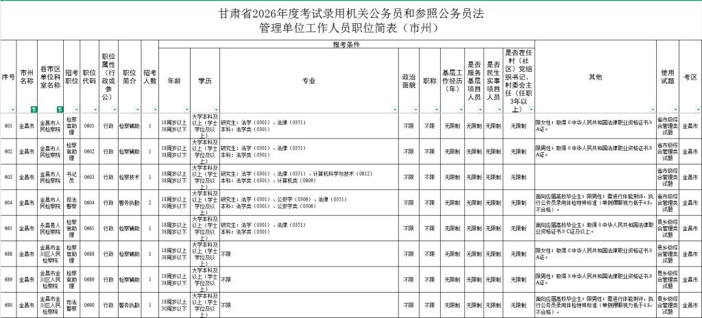 金昌市检察机关招录职位表